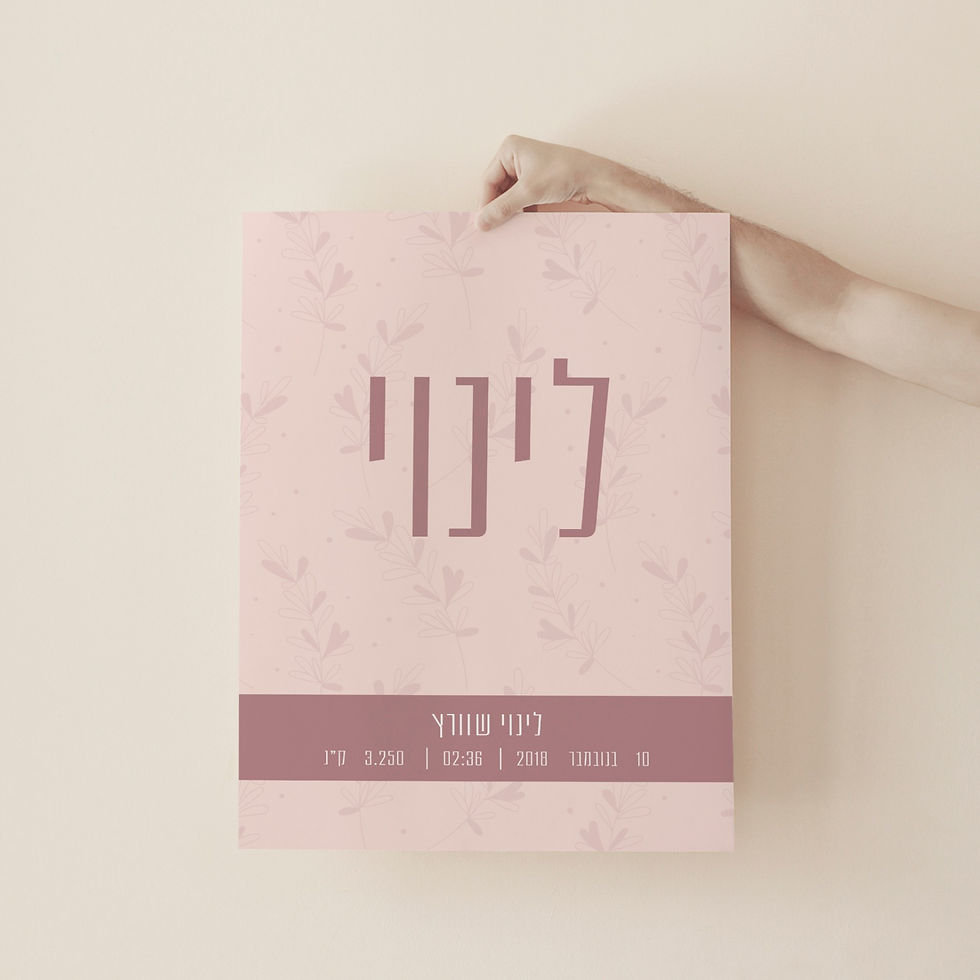 שמו לצד תאריך הלידה, השעה והמשקל מהלידה, בעיצוב עדין וייחודי